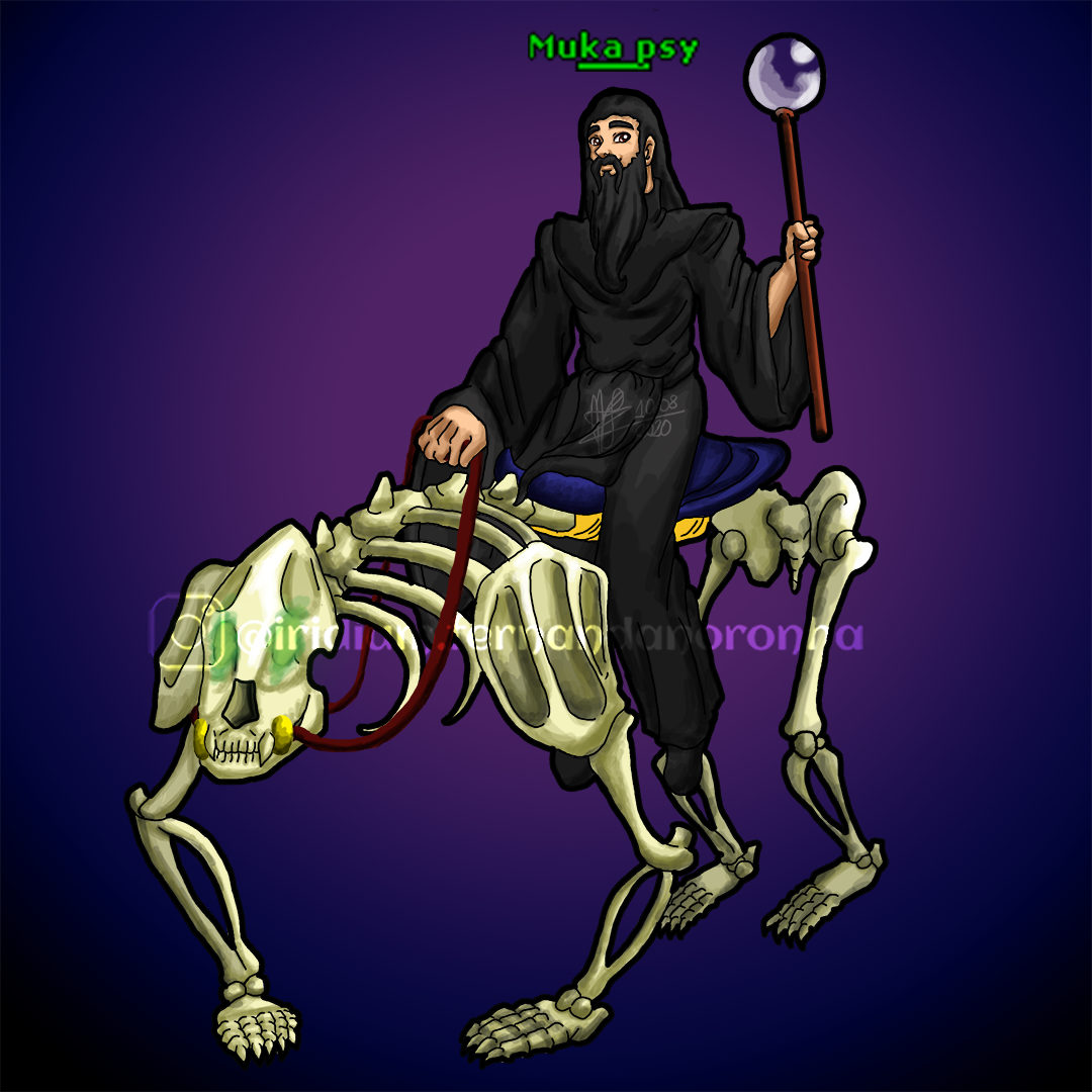 Anatomia animal (especialmente a parte esquelética) não é meu forte, mas, é através de desafios que a gente evolui! Obrigada @samuelsanttooos pelo desafio proposto, confiando a mim o seu personagem, Muka psy, montado em um Undead Cavebear!